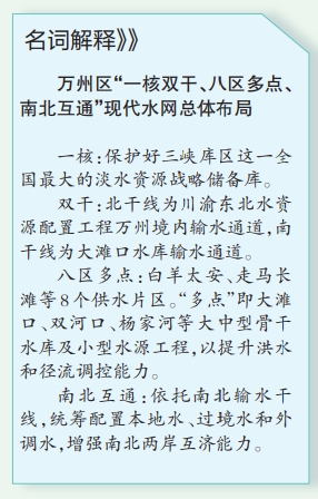 大江至此,万川毕汇。坐拥得天独厚的水资源优势,如何让江河湖泊成为经济社会高质量发展的“水动力”?万州人因地制宜,完善水资源配置体系和互联互通配置格局,通过建设水源工程,促进水源连通,分配调度河流水量,进一步补齐区域水资源配置短板。