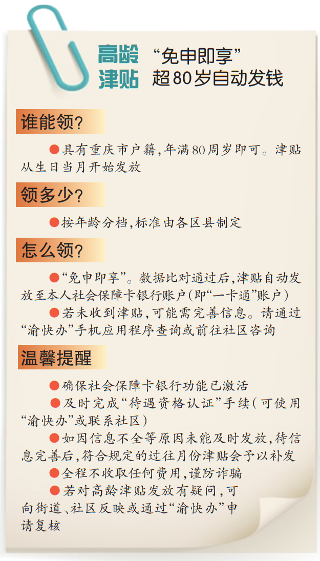 随着我市老龄化程度加深,如何让社会福利更精准、更温暖送达每位老人手中,成为政策创新的重要方向。近日,重庆市通过“数据赋能、免申即享”的智慧化模式,为全市80岁及以上户籍老年人悄然送上了一份“礼物”——高龄津贴。无需申请、无需跑腿,只要年龄达标、户籍在渝,津贴便会通过“一卡通”系统自动发放至老人指定的银行账户。