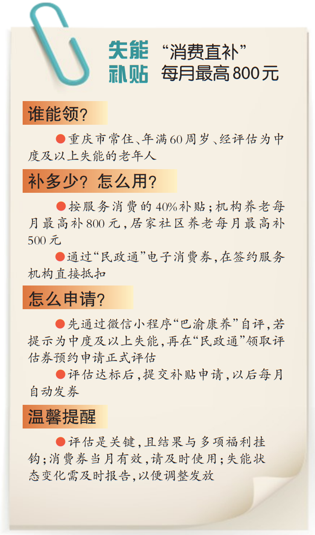 面对失能老人的照护刚需,如何切实减轻家庭负担,同时也提振专业养老服务消费?今年7月,重庆作为国家试点城市,启动了一项惠及数万家庭的新政策——向中度及以上失能老年人发放养老服务消费补贴。这项政策的核心是“国家发钱”直接补贴老人购买各类养老服务,让专业照护服务“用得起”“用得好”。