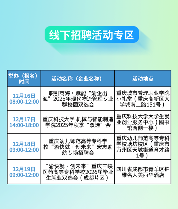 具体来说,线下招聘活动有4场:重庆科技大学机械与智能制造学院2025年秋季双选会、重庆城市管理职业学院举行的职引商海·赋能“渝企出海”2025年现代物流管理专业群校园双选会、重庆幼儿师范高等专科学校“渝快就·创未来”宏志助航专场招聘会和“渝快就·创未来”重庆三峡医药高等专科学校2026届毕业生就业双选会(成都片区)。
