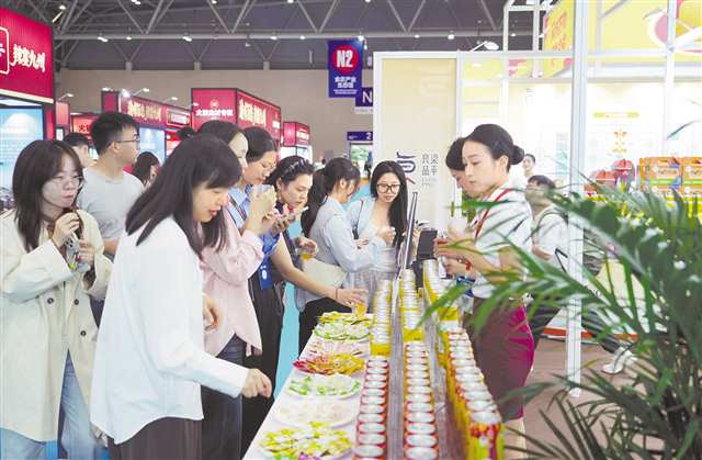 2025重庆市食品及农产品加工高质量发展产业生态大会期间,市民在梁平展馆品尝购买梁平良品 摄/向成国