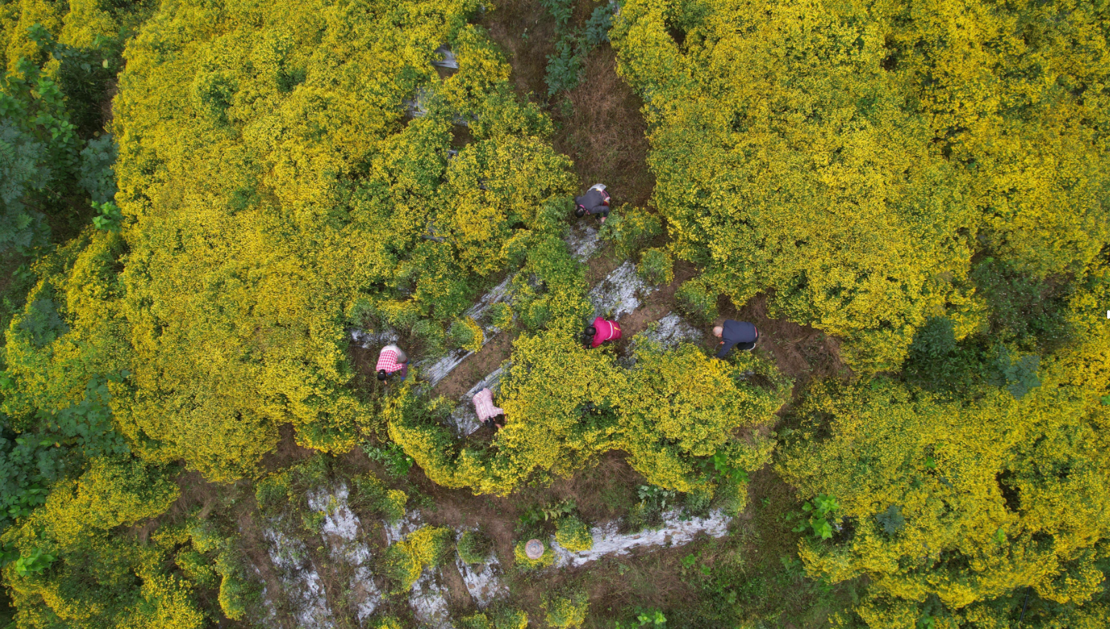毓青山的微风拂过,送来的不是凛冽,而是一阵阵清甜醉人的花香。麻土坡上,村民们正弯着腰,在一人多高的金色花丛中穿梭,挥舞着镰刀,采收着一丛丛野菊花。