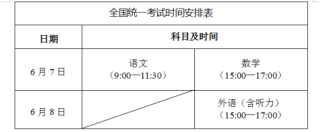 全国统一考试科目考试时间安排在6月7日全天和6月8日下午,其中语文考试时长为150分钟,数学、外语考试时长均为120分钟;普通高中学业水平选择性考试科目考试时间安排在6月8日上午和6月9日全天,每科考试时长均为75分钟。报考外语专业的考生,还应参加外语口试,外语口试安排在6月10日进行。
