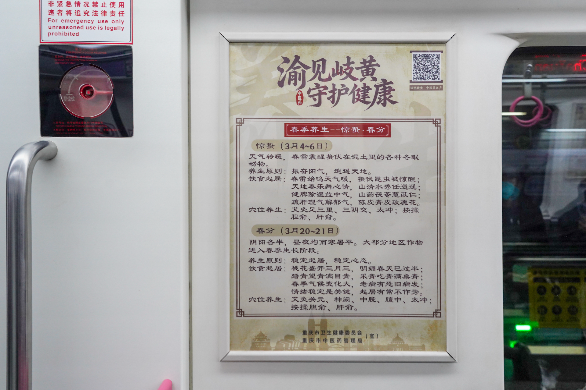 走进专列车厢,浓郁的中医药文化氛围扑面而来。扶手、车厢壁等醒目位置,通过图文并茂的形式精心呈现重庆道地药材“渝十味”、国家级传统医药类非物质文化遗产项目、古代名医典故、节气养生常识、巴渝特色药膳食谱及经典养生疗法等内容,系统展现巴渝中医药文化的独特魅力。为增强互动体验,车厢内还设置了专属二维码,乘客扫描后即可聆听中医药科普专栏,实现从“视觉阅读”到“视听沉浸”的立体体验升级,让专业的中医药知识以更通俗、更生动的方式触达群众。