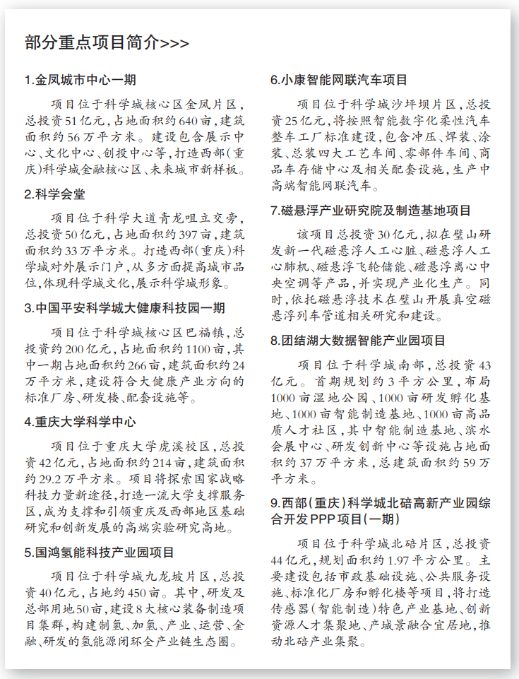 从地域来看,科学城核心区(重庆高新区直管园)项目共15个、总投资660亿元,占集中开工项目总投资额的62%。其中,投资200亿元以上项目1个、50亿元以上项目5个、10亿元以上项目13个。具体包括金凤城市中心一期、科学会堂、中国平安科学城大健康科技园一期、重庆大学科学中心、科学谷二期、重庆大学附属肿瘤医院科学城院区等。