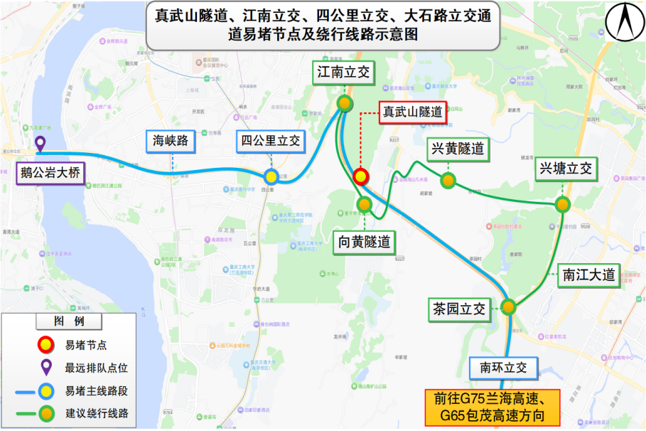 绕行建议:在拥堵时段,建议车辆从石马河立交驶出,经北环立交、礼嘉立交、鼎新大道绕行,在王家坪立交驶入。