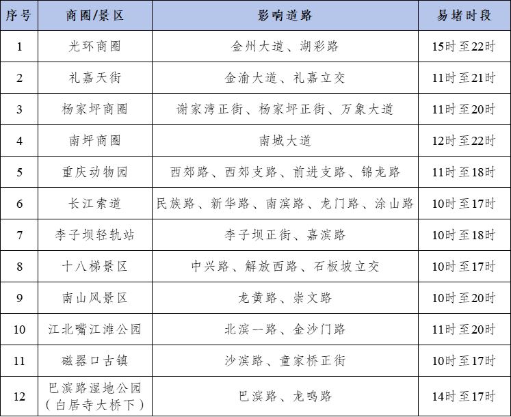 二是洪崖洞景区,易堵时段集中在16时至23时左右,主要拥堵道路为千厮门大桥、民族路等周边道路;