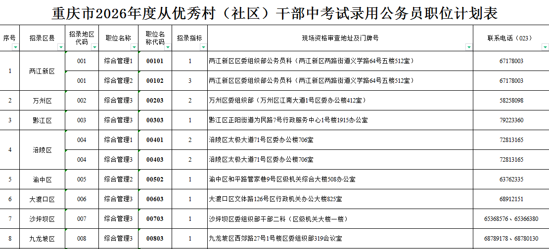 1月16日,上游新闻从重庆市人力资源和社会保障局官网获悉,重庆市公务员局日前发布了《重庆市2026年度从优秀村(社区)干部中考试录用公务员公告》。
