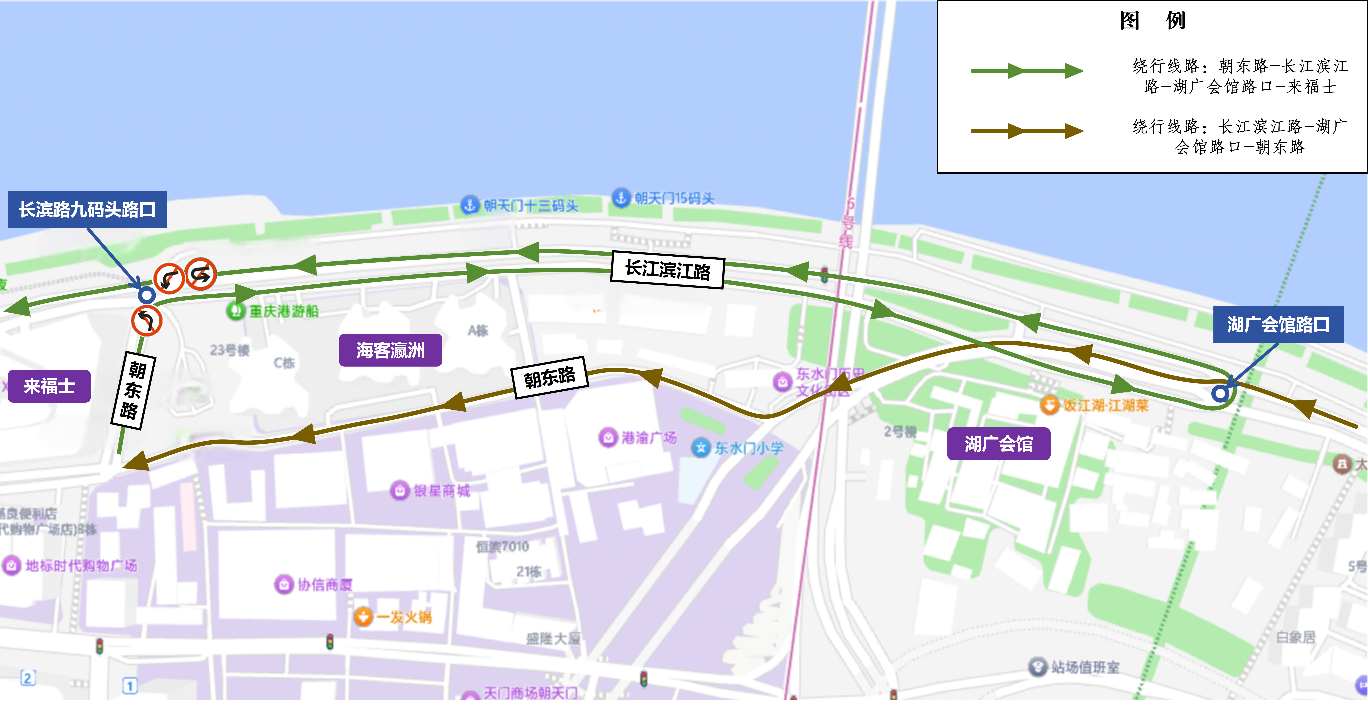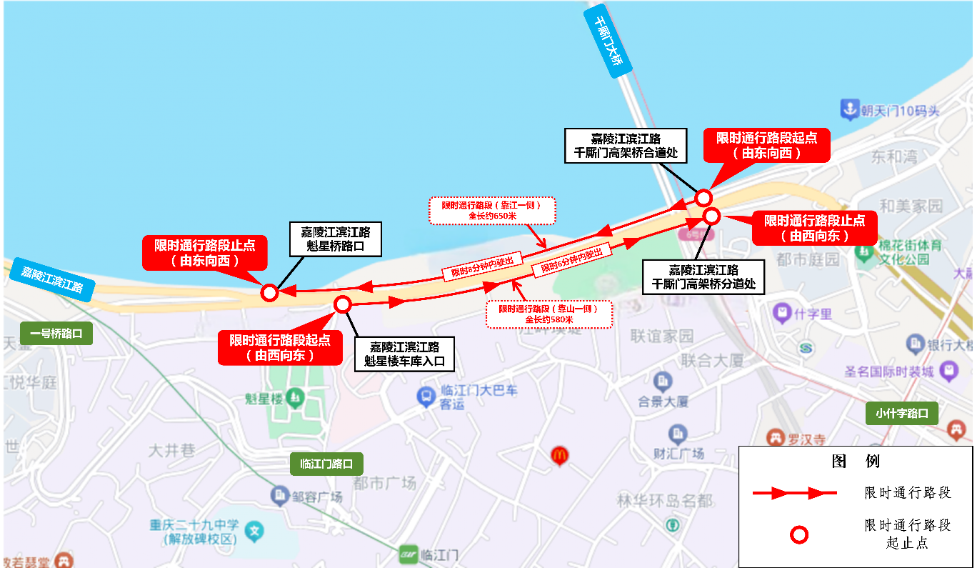 嘉陵江滨江路洪崖洞段限时通行示意图。