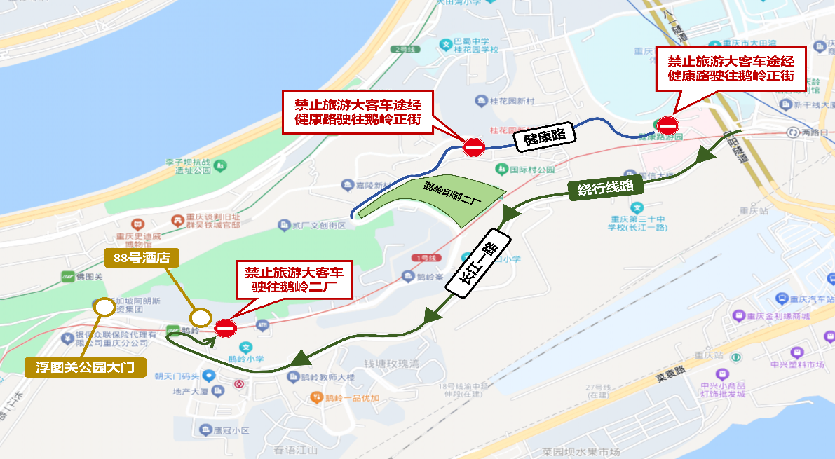 每日07:00至18:00,禁止旅游大客车经健康路往鹅岭正街行驶,可改道经长江一路前往鹅岭正街,旅游大客车到达鹅岭正街后禁止驶入印制二厂景点。