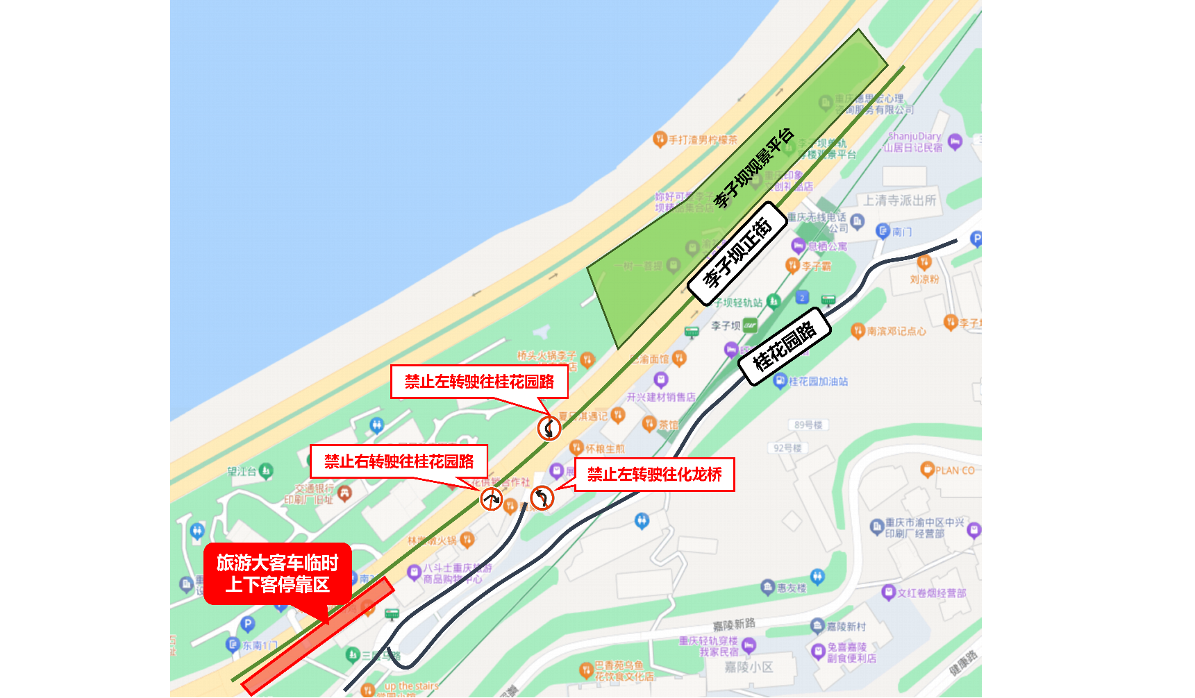 每日07:00至18:00,禁止李子坝正街往桂花园路以及桂花园路往化龙桥方向车辆在李子坝正街桂花园路路口左转。李子坝正街自中石油牛滴路加油站出口上跨桥处起至李子坝公交站分道处红绿灯止单向700米路段,区域内实施8分钟限时通行交通管理措施,所有车辆驶入该区域后,均需在8分钟内驶离;自李子坝正街嘉陵新路路口起至李子坝正街与嘉陵江滨江路匝道汇入交叉口止单向500米路段,区域内实施6分钟限时通行交通管理措施,所有车辆驶入该区域后,均需在6分钟内驶离(特种车辆除外)。同时,上述路段双向区域禁止旅游大客车上下客,请在指定区域规范停放。