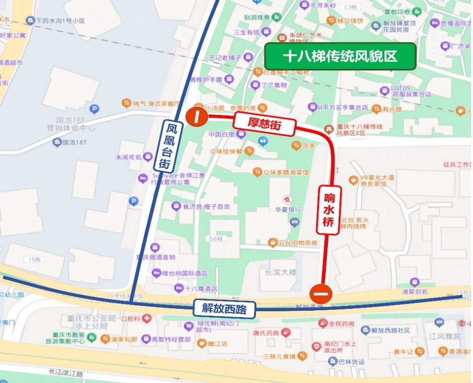 每日16:00至24:00,适时对沧白路、临江路(五四路至临江支路段)、临江支路、江家巷、棉花街、民族路(新华路至沧白路单向段)、千厮门大桥、东水门大桥(南岸区往渝中区方向及其附属匝道)、千厮门隧道(东水门大桥往千厮门大桥方向)进行交通管制。解放碑核心区域部分道路每日07:00至23:00限制19座(含)以上大型客车通行。