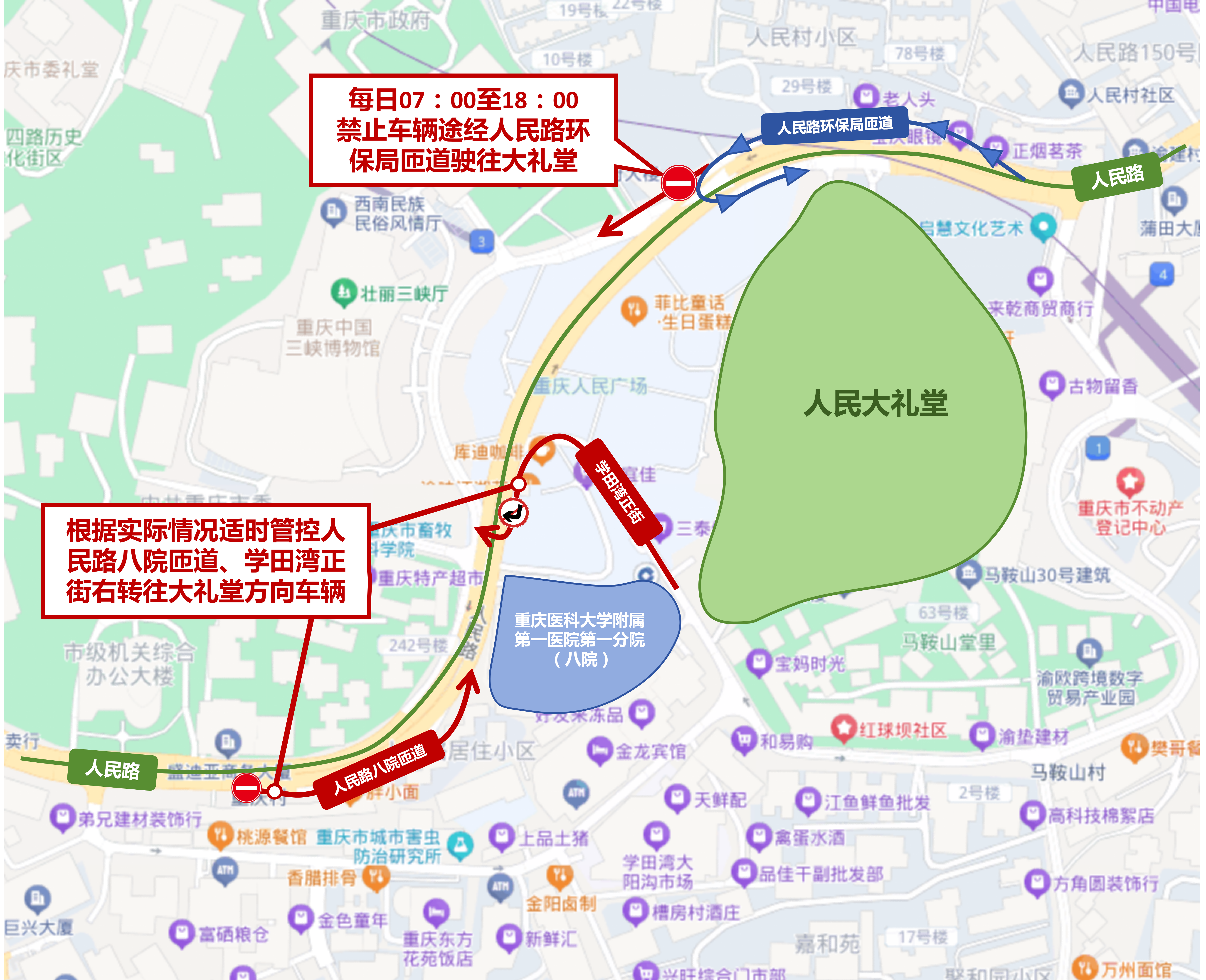 每日07:00至18:00,禁止车辆经人民路匝道往大礼堂方向行驶。将根据实际情况适时管控人民路八院匝道、学田湾正街右转往大礼堂方向车辆。旅游大客车请前往人和街指定区域临时停车上下客。