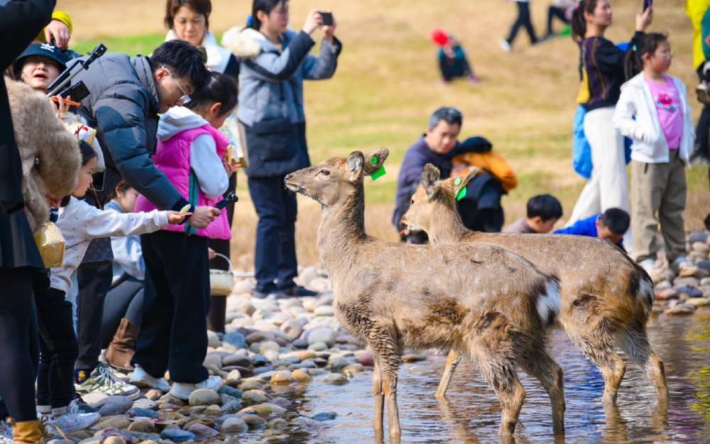 该公园创新融合“国风美学”与“滨水生态”,打造沉浸式文化空间,新增建设了重庆主城首个梅花鹿生态互动乐园,游客能够近距离和小鹿接触投喂。目前,公园呦呦鹿鸣谷的梅花鹿已增至45只。