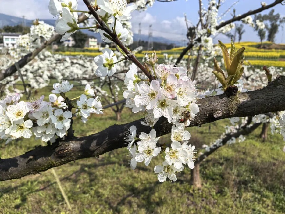 成片李树沿山坡层层铺展,洁白花朵缀满枝头,嫩黄花蕊点缀,花香清甜。远眺如白色花海,与青山、农舍相映,治愈感拉满。