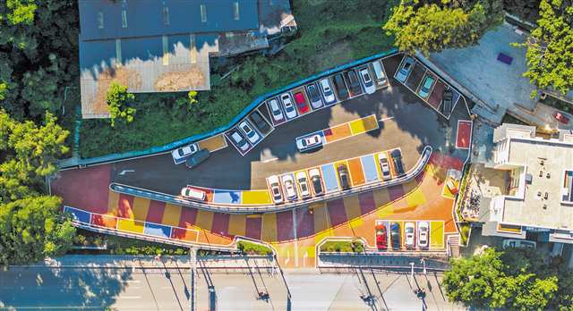 10月9日,北碚区龙凤桥街道毛背沱片区老旧小区改造现场,工人加紧进行扫尾作业。图为新建成投用的停车场。记者 李雨恒 摄/视觉重庆