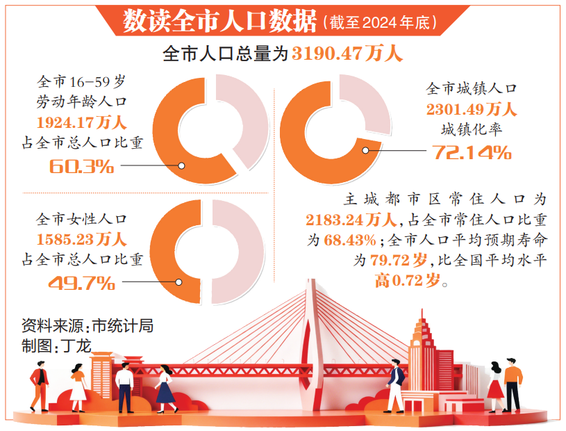 “十四五”以来,我市人口分布继续向城镇和主城都市区集聚。截至2024年底,全市城镇人口为2301.49万人,城镇化率为72.14%;主城都市区常住人口为2183.24万人,占全市常住人口比重为68.43%;全市人口平均预期寿命为79.72岁,比全国平均水平高0.72岁。