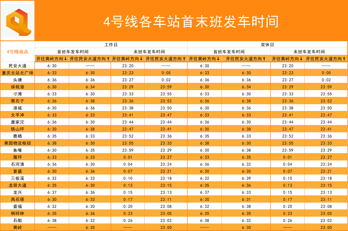 新版列车运行图启用后,各站发车时间将有变动,请乘客注意4号线最新版各车站首末班车时刻表。