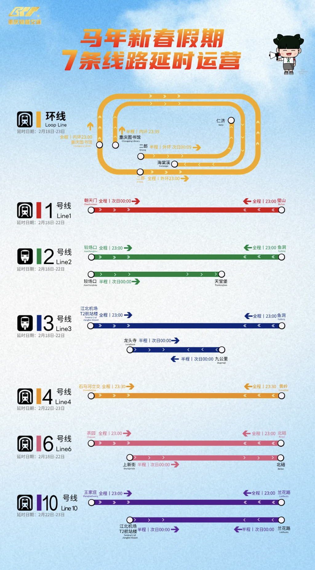 2月15日—2月17日,在线网双休日运营组织基础上调整运行交路、优化发车间隔,3号线主线开行鱼洞至江北机场T2航站楼、九公里至龙头寺交路,提升出行直达性;21:00后,1、6号线及环线开行约6分钟间隔,增加夜间时段运输能力。