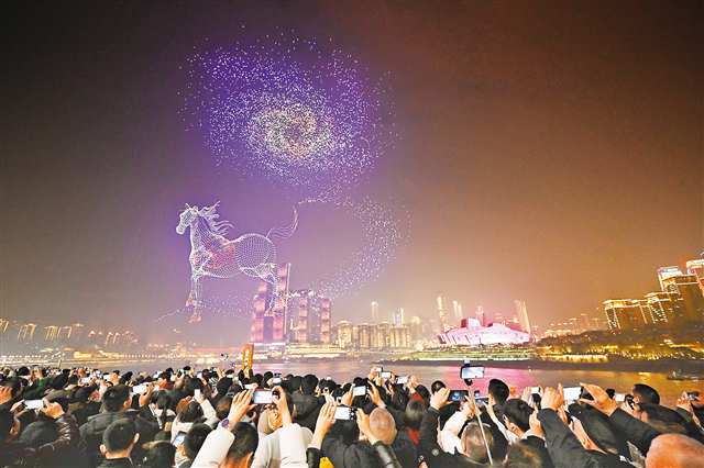 “非常美丽!我感受到了灯光里的祝福,也将这份祝福送给身边的每一个人。”来自北京的贾女士因为爱人在重庆,经常来渝过春节,她表示,无人机灯光秀热闹又喜庆,让她更加感受到重庆这座魔幻之城的独特魅力。
