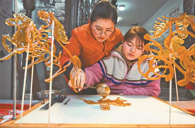 1月21日,龙兴古镇,龙兴李氏糖画非遗代表性传承人李梅手把手教18岁的大女儿李雨洋制作糖画。记者 刘力 摄/视觉重庆