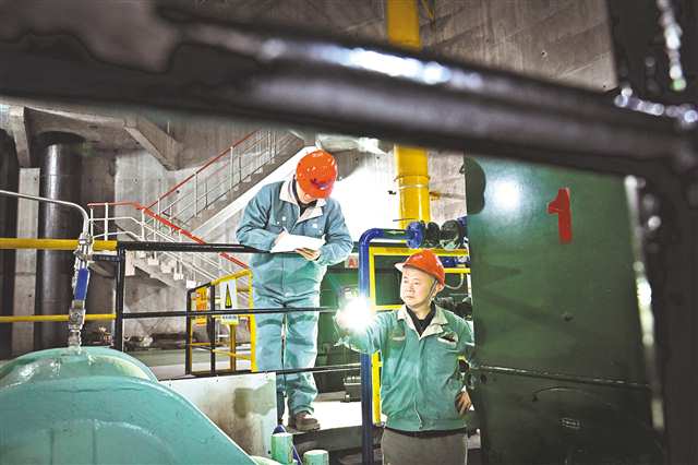 2月18日,大渡口区丰收坝水厂取水泵房,维修组的帅圣欧(右)和岳倪在检查运行中的电机水泵。该水厂承担着百万人的供水重任,日供水规模30万立方米。春节期间,9个岗位的18名工作人员24小时轮班值守,确保城市“水龙头”不间断运行。记者 张锦辉 摄/视觉重庆