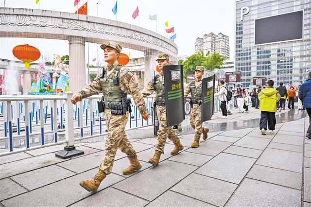 2月19日,重庆动物园附近,武警重庆总队执勤第二支队的官兵们正在巡逻。春节假期,该支队官兵们坚守执勤一线,采取定点警戒与巡逻相结合的方式,为市民游客筑起一道坚实的安全屏障。通讯员 刘亢 张俊 摄/视觉重庆