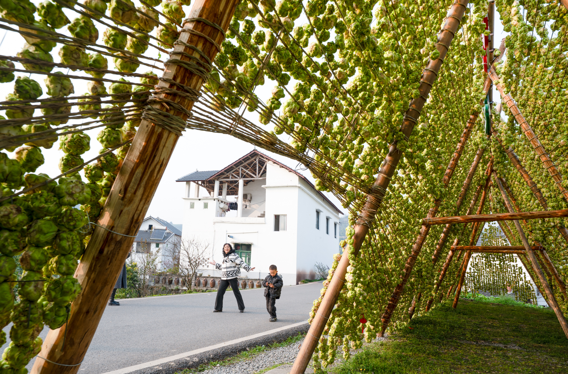 涪陵区二渡村,游客从榨菜风干架前走过。(资料图片)记者 张春晓 摄