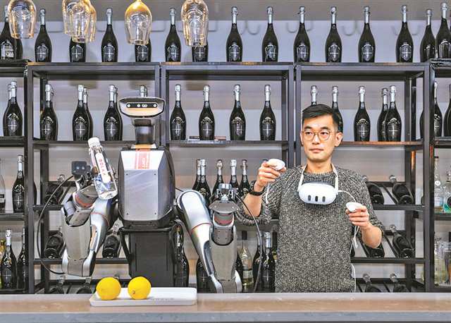 图2:位于两江新区的博拉AI模创空间,具身智能机器人TRON 2跟随训练师的动作同步拿起一瓶矿泉水。(重庆日报资料图片)记者 张锦辉 摄/视觉重庆