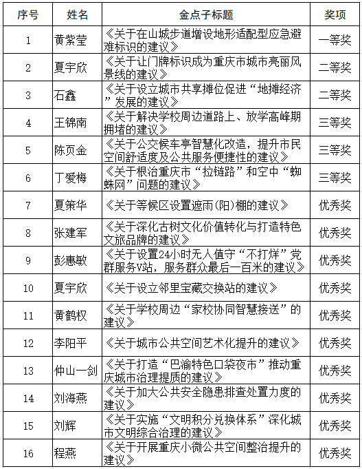 评审会上,专家从问题针对性、对策可行性、创新示范性等多个维度,对入围的“金点子”进行严谨评审与现场投票。最终,16条兼具前瞻性、操作性与民生温度的建议脱颖而出,获评2025年度“金点子”。其中,《关于在山城步道增设地形适配型应急避难标识的建议》荣获一等奖。该建议针对重庆地形特点,提出了三维场景化标识、触感盲文与语音模块联动等创新方案,直击应急疏散痛点。《关于让门牌标识成为重庆市城市亮丽风景线的建议》与《关于设立城市共享摊位促进“地摊经济”发展的建议》获得二等奖。聚焦学校周边拥堵治理、公交候车亭智慧化改造、根治“拉链路”等民生难题的3条建议获得三等奖。此外,遮雨棚设置、古树文化价值转化、24小时党群服务V站、邻里共享交换、口袋夜市打造、文明积分兑换体系、小微公共空间整治等10条建议获得优秀奖。