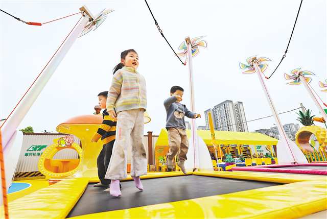 当前,重庆及周边省市中小学生迎来春假,学生们纷纷走进大自然,或休闲娱乐,或研学旅行,乐享春假时光。图为4月2日,沙坪坝区重庆融创文旅城,小朋友们在跳蹦蹦床。特约摄影 孙凯芳\视觉重庆