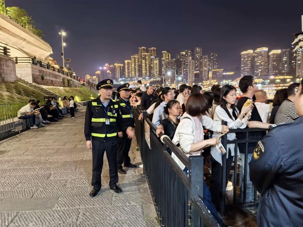 两江游迎客流高峰,执法队员引导游客有序排队。受访者供图