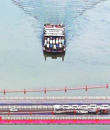 一艘滚装船通过鱼嘴长江大桥。(重庆日报资料图片)特约摄影 钟志兵 摄/视觉重庆