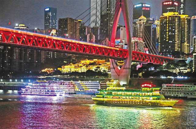 2月5日晚,观景游轮行驶在东水门大桥下。虎年春节,不少市民和外地游客选择乘坐两江游轮观赏两江四岸迎春灯饰,喜庆梦幻的光影赢得点赞。特约摄影 钟志兵/视觉重庆