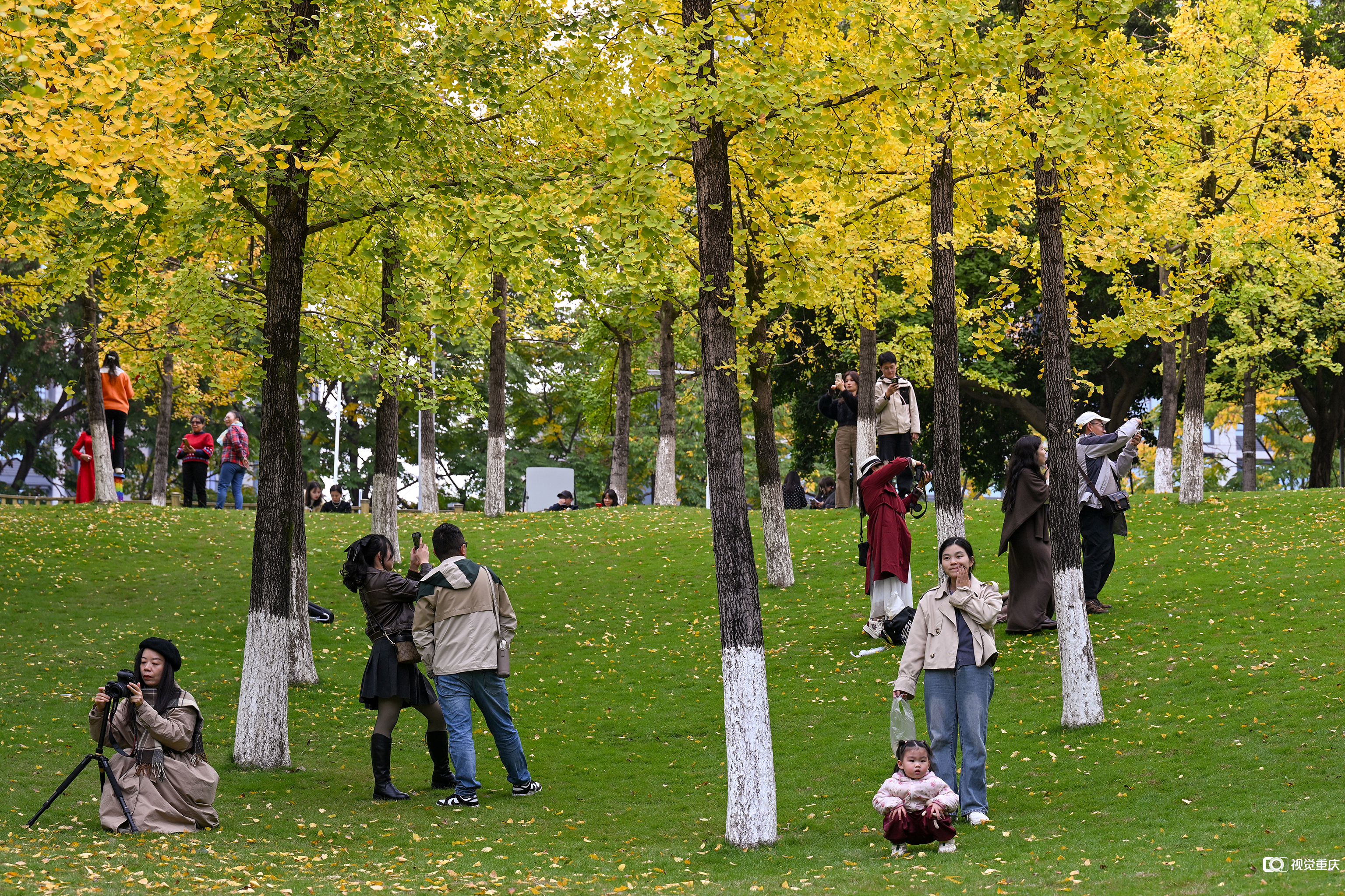 2025年11月15日,市民在两江新区中央公园欣赏冬天的黄叶,打卡留念。记者 张春晓 摄