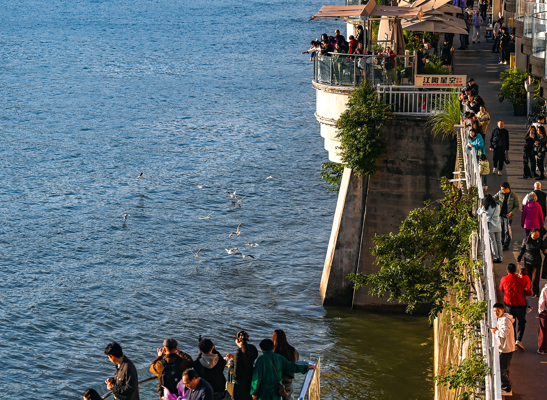 2025年11月19日,南岸区南滨路两江交汇水域,大批西伯利亚红嘴鸥在水中嬉戏,吸引众多市民驻足观赏。记者 郑宇 摄
