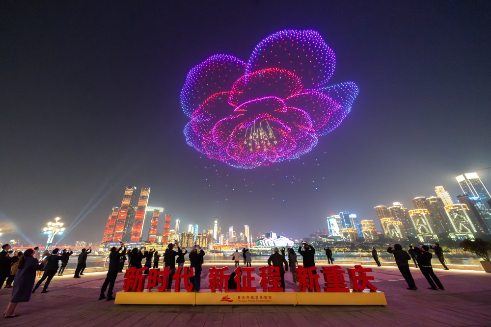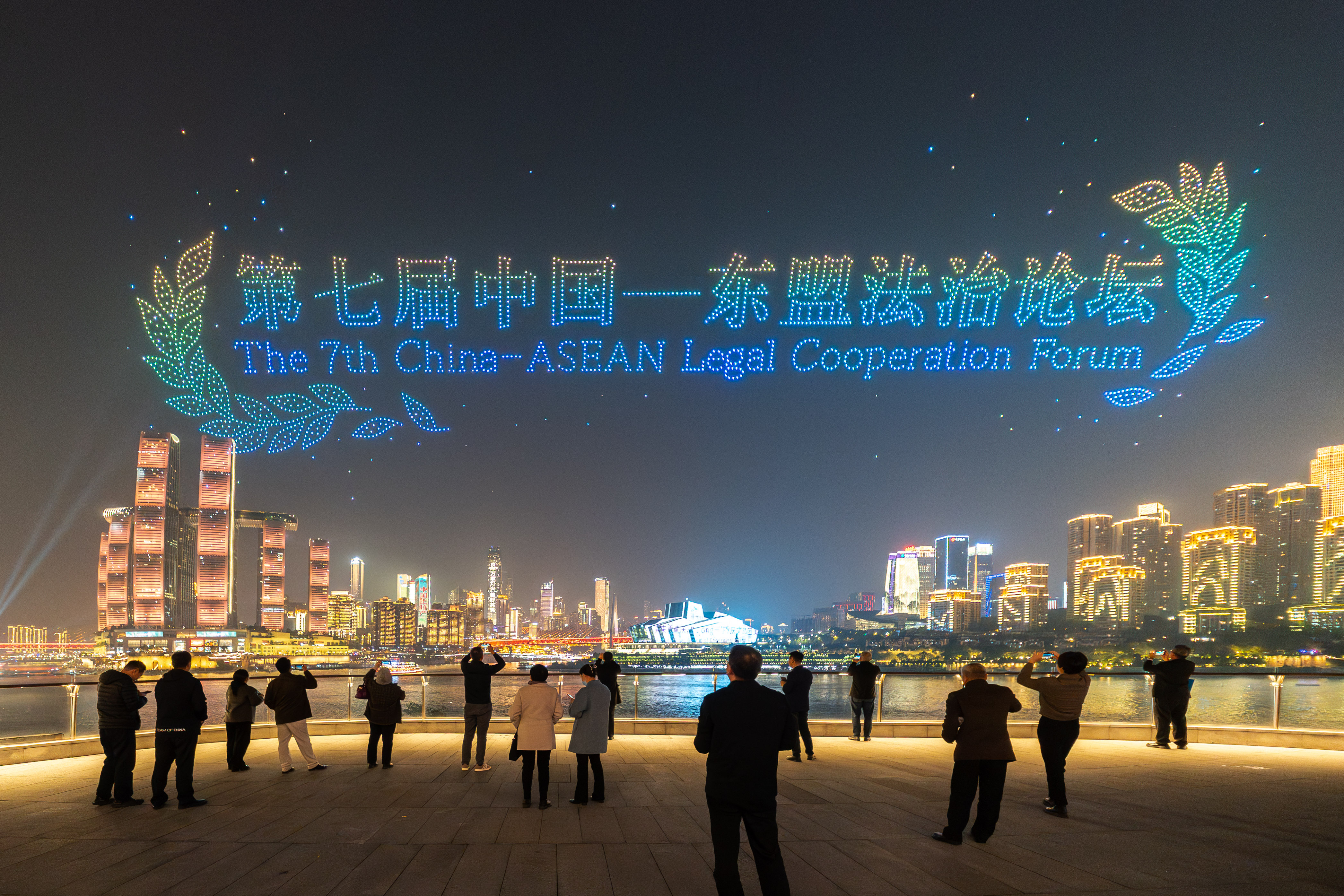 当日晚,“新韵重庆”无人机灯光秀在两江四岸核心区夜空上演,作为第七届中国—东盟法治论坛的主题展演,以璀璨光影将“法治之光”洒满山城。数百架无人机依次编队,呈现出论坛中英文字样、象征公平正义的金色天平、守护万家灯火的法槌等生动画面,生动诠释了“加强中国—东盟法治合作,共建周边命运共同体”的深刻主题,为观众带来一场科技与法治交融的视觉盛宴。