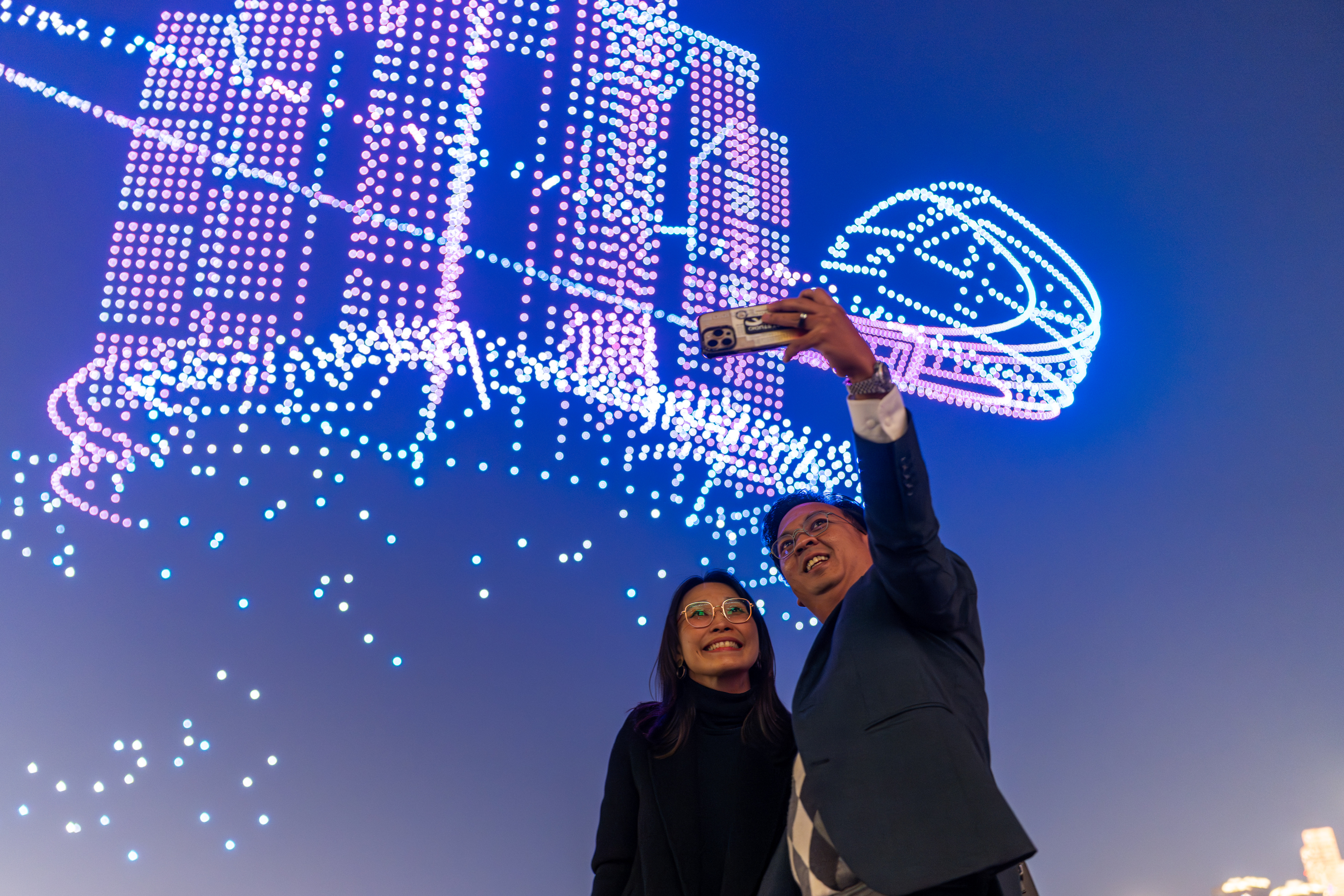 11月20日,重庆市规划展览馆,嘉宾以无人机灯光秀为背景合影留念。记者 李雨恒 摄