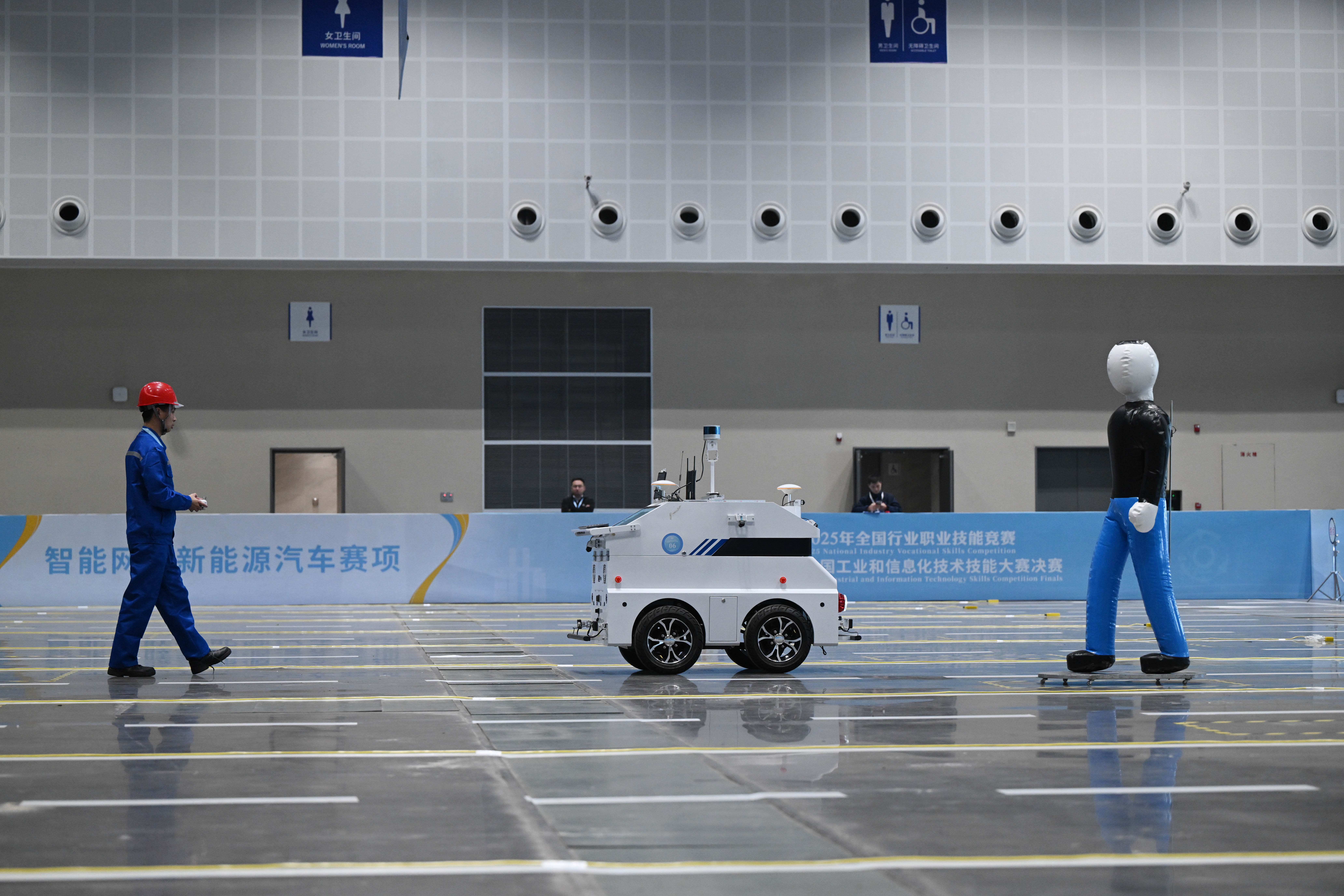 11月27日,重庆科学会堂,参赛选手正在进行新能源汽车自动驾驶综合测试。记者 罗斌 摄