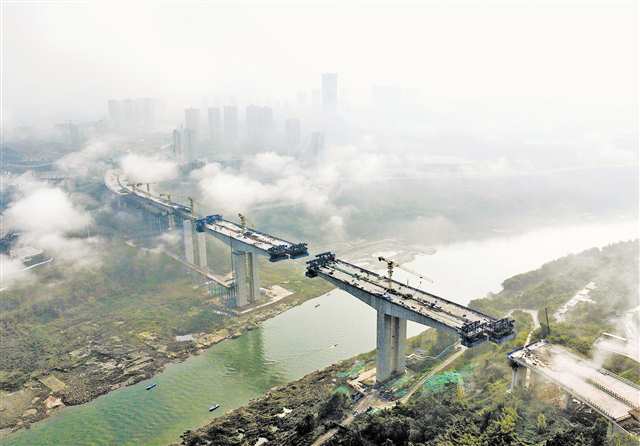 1月10日,宝山嘉陵江大桥正在进行桥梁架设施工。