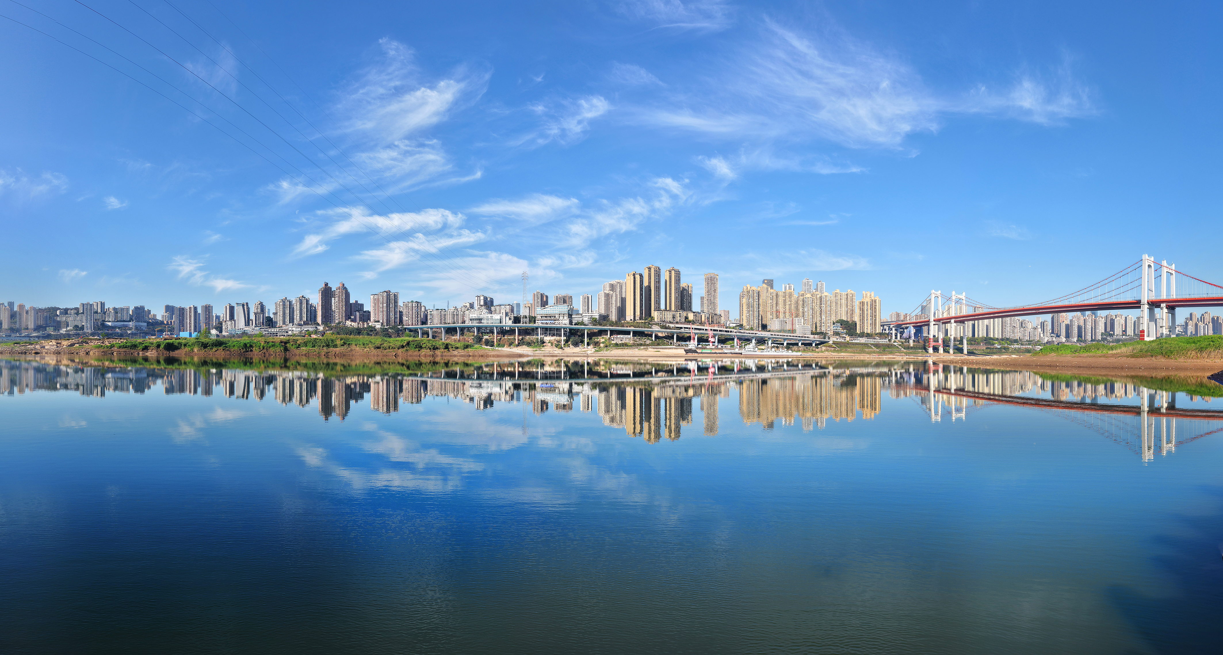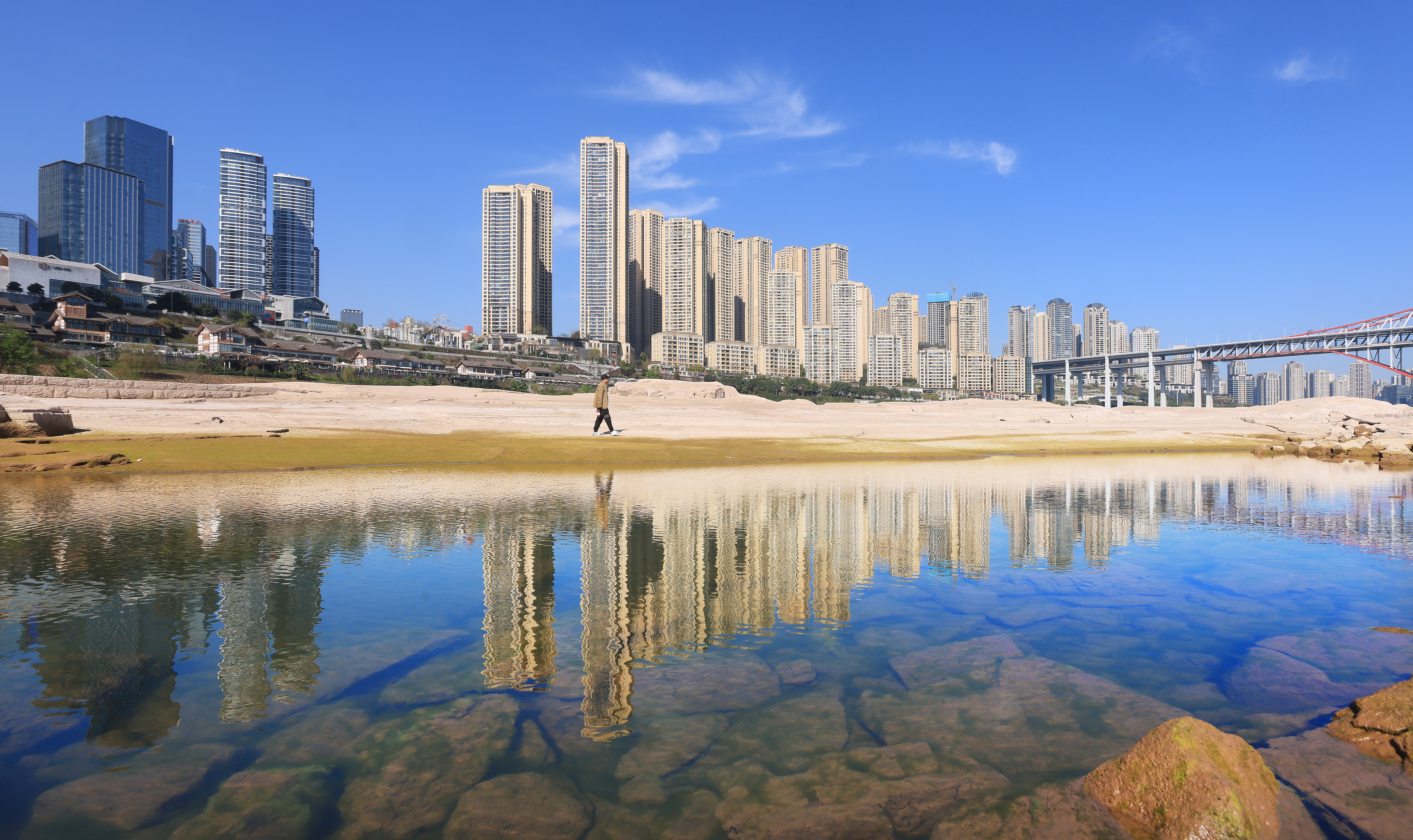 3月10日,九龙坡区九滨路上的林立高楼与蓝天白云倒映在长江之中,构成一幅美丽图画。特约摄影 钟志兵