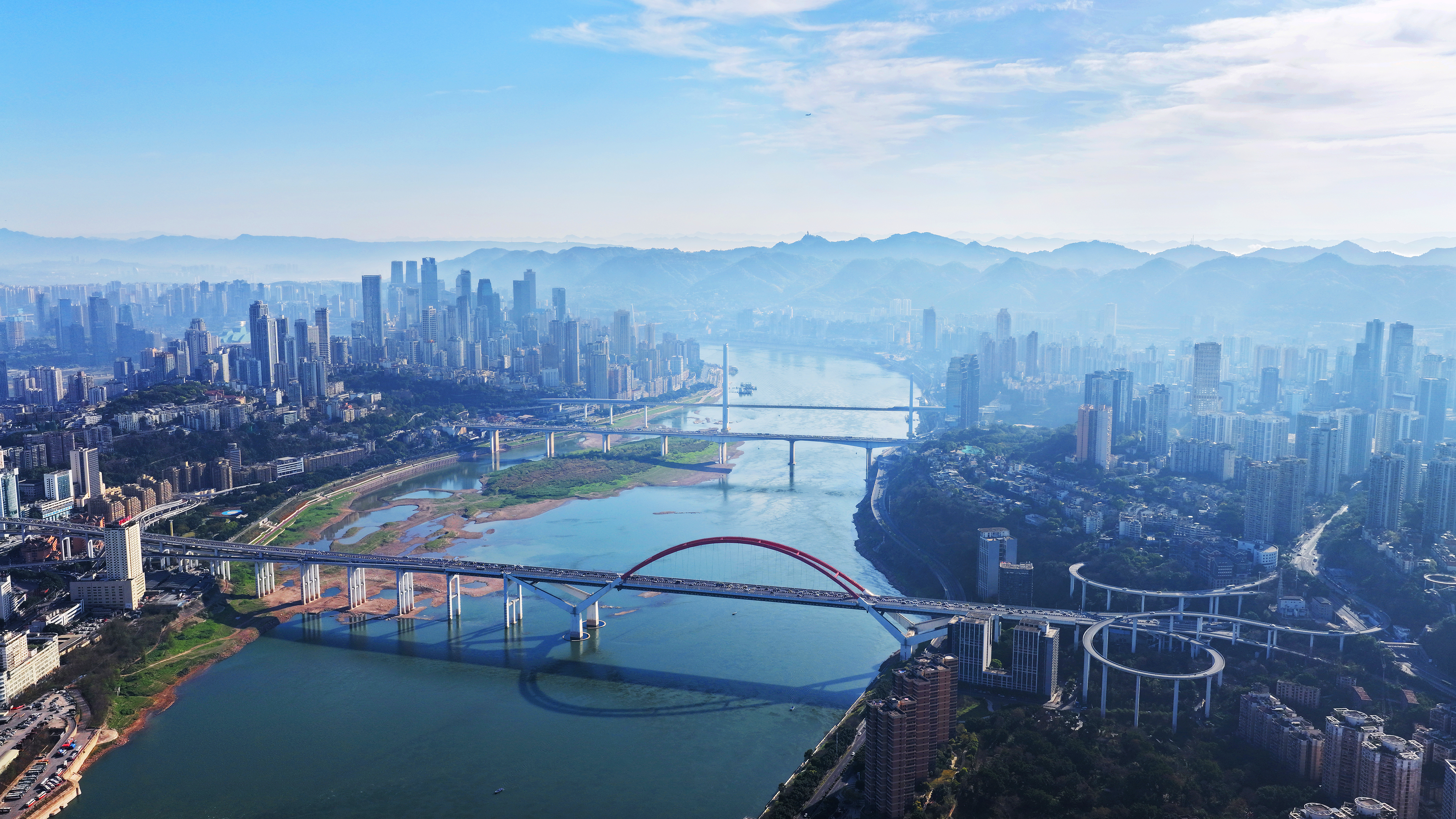 3月10日,南滨路,长江春水宛若一条蜿蜒曲折的蓝色飘带,串起两岸城市美景(无人机照片)。特约摄影 钟志兵