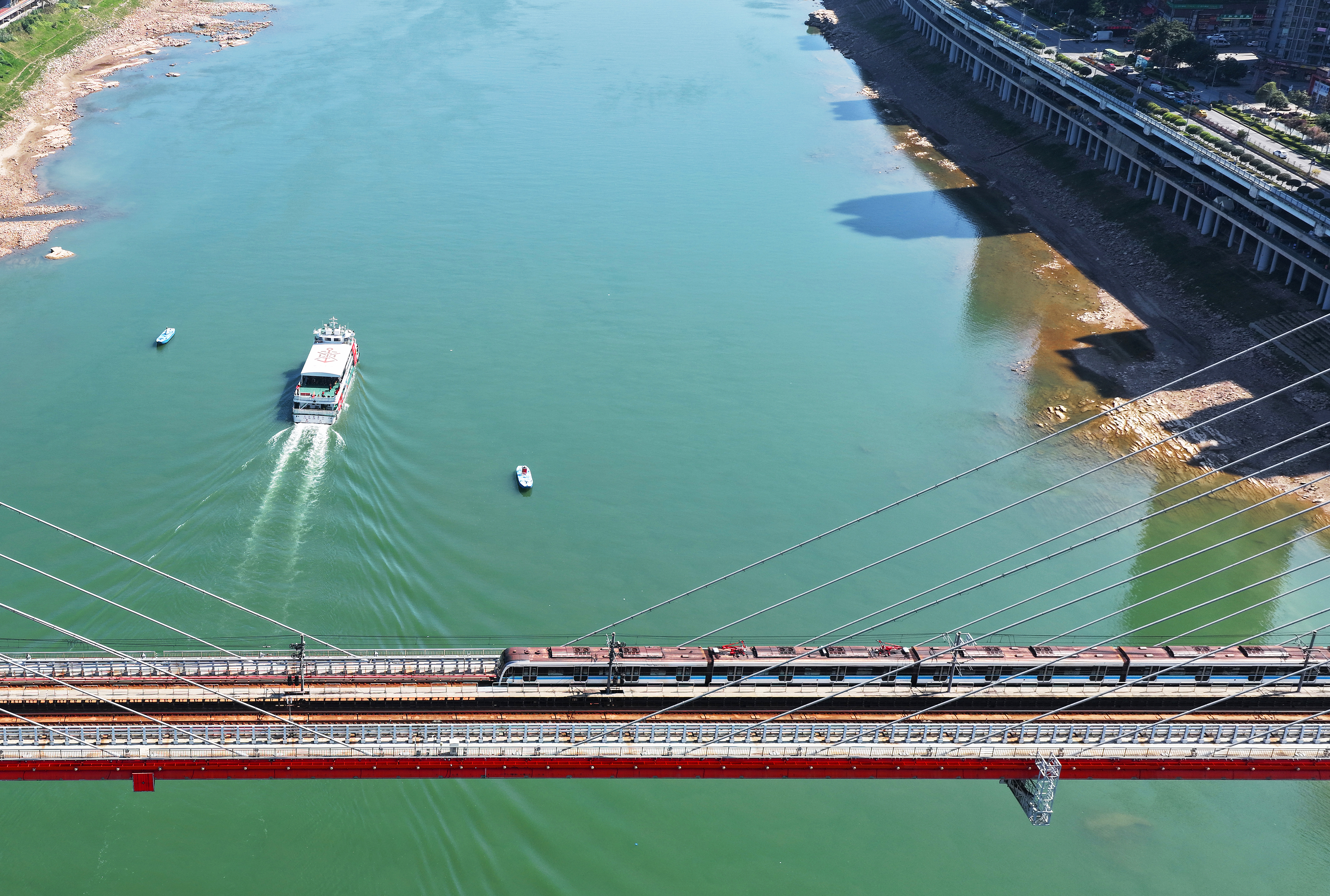 3月10日,沙坪坝区沙滨路,轨道列车与轮渡在清澈的嘉陵江上奏响一曲和谐的交通交响曲(无人机照片)。特约摄影 钟志兵