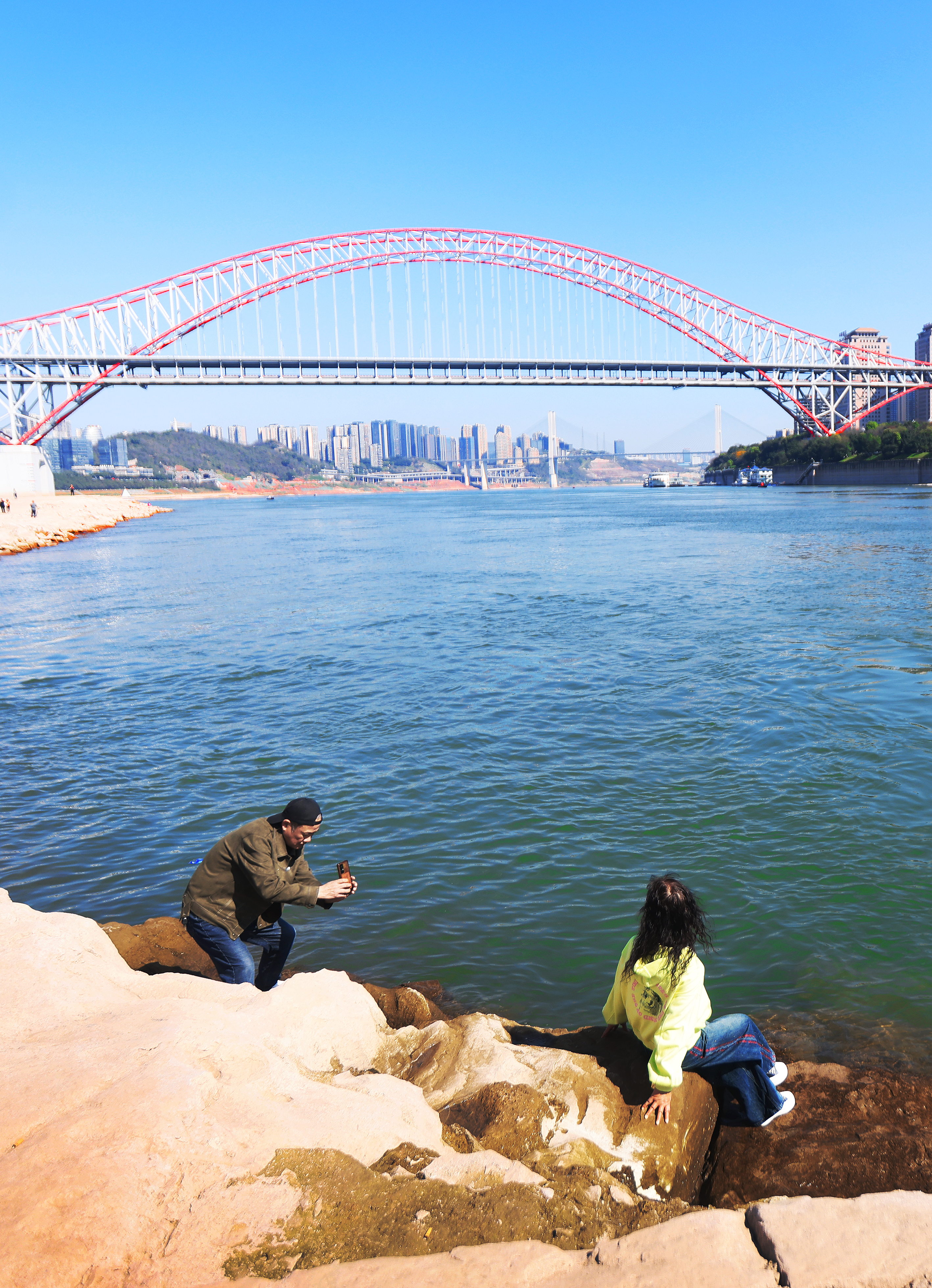 3月10日,两江新区北滨路,市民正以清清长江水为背景拍照留念。特约摄影 钟志兵