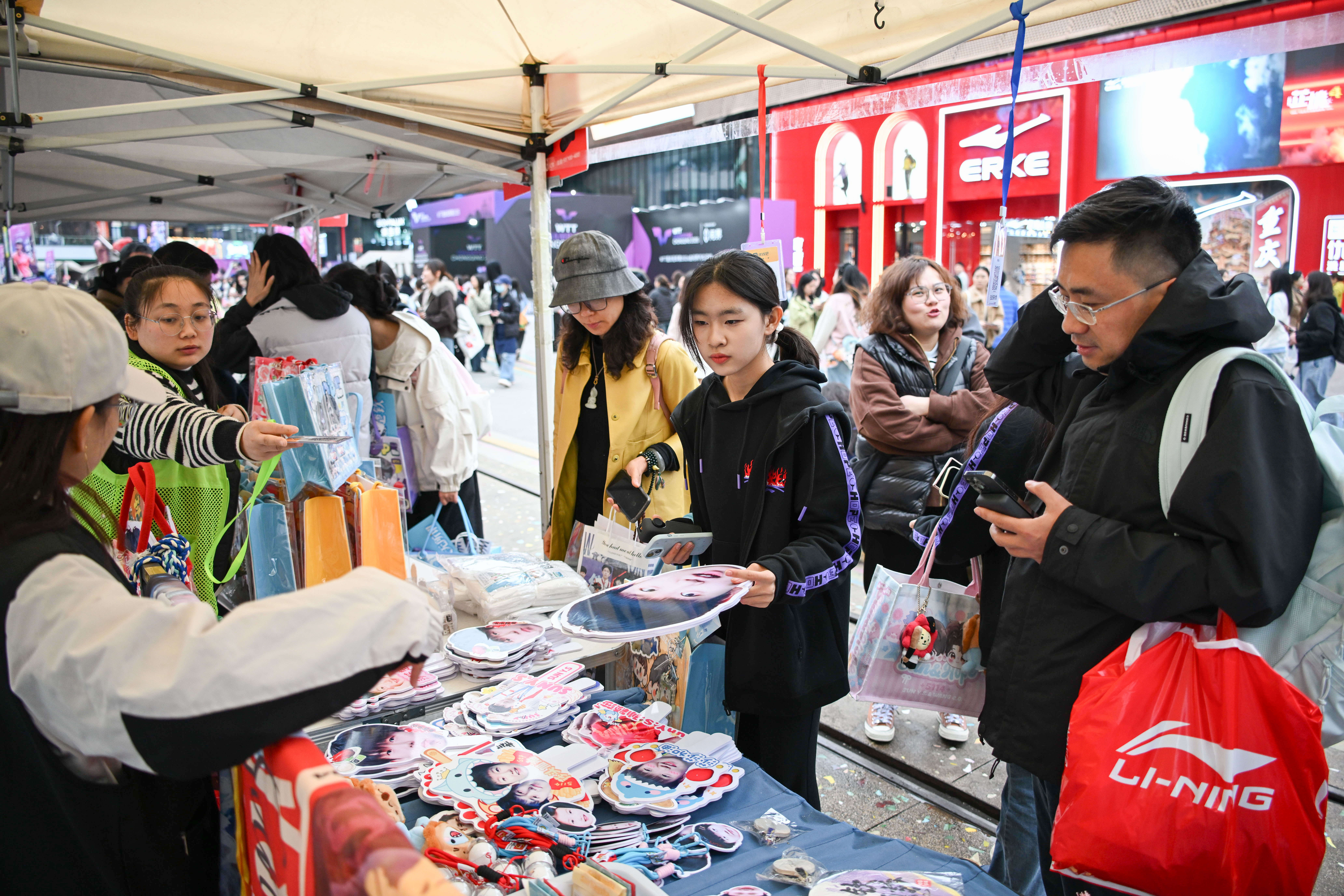 3月14日,重庆巴南华熙生物·润百颜ECM中心,球迷购买赛事周边商品。记者 谢智强 摄