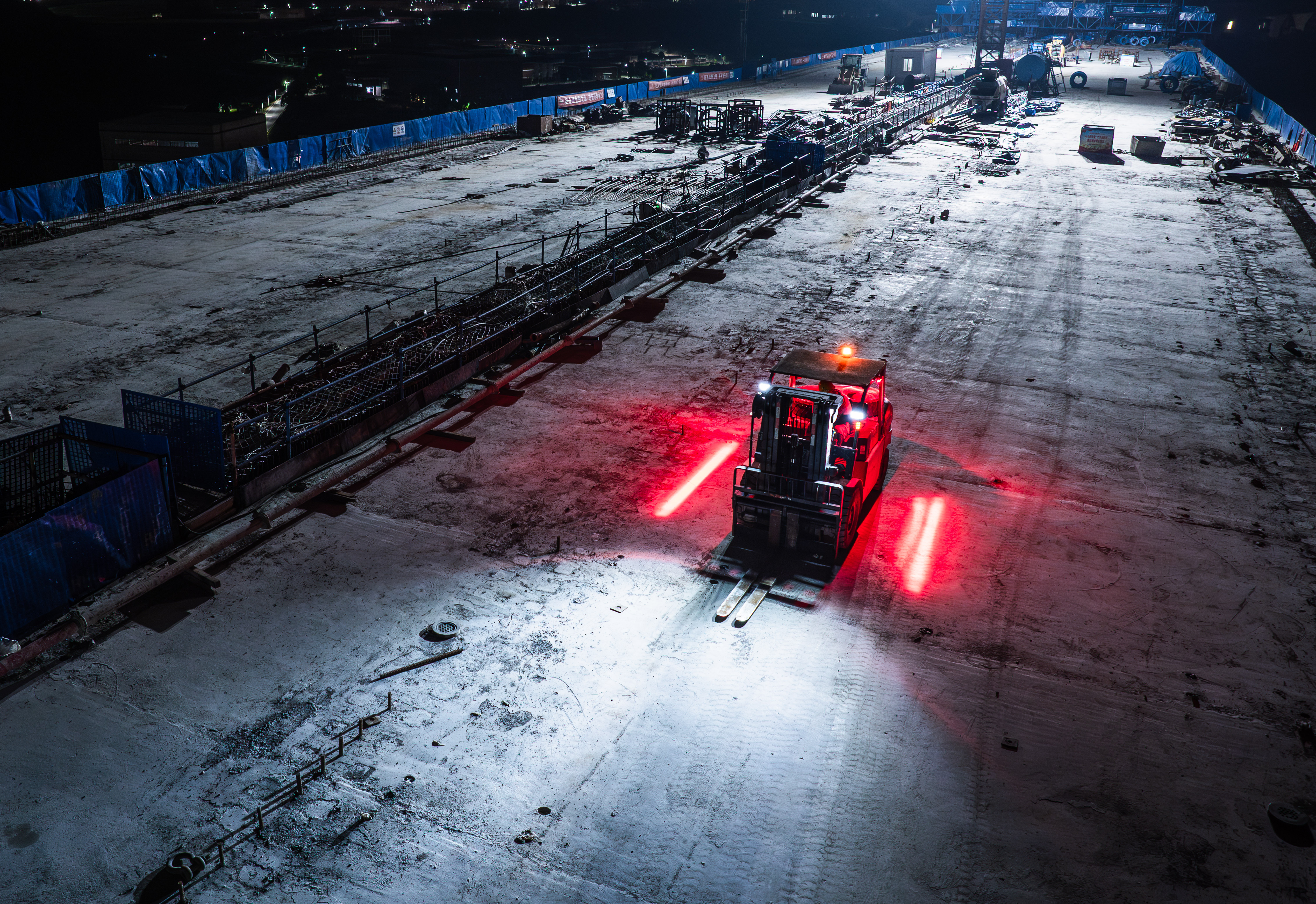 4月8日,宝山嘉陵江大桥施工现场,工人在操作叉车进行作业(无人机照片)。记者 李雨恒 摄