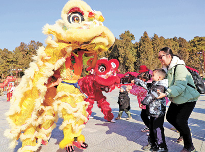 河南南阳卧龙岗文化园内,市民在欣赏舞狮表演。高 嵩摄(新华社发)