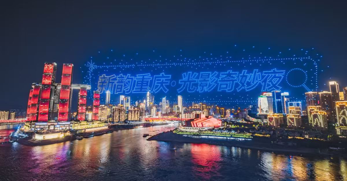 两江四岸、灯火璀璨,“新韵重庆”无人机灯光秀表演正以科技光影点亮山城夜空。
