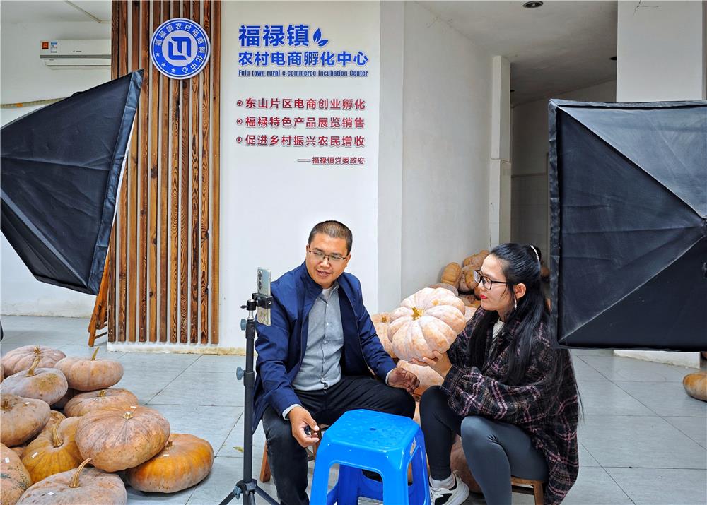 与此同时,在福禄镇农村电商孵化中心,电商创业导师段光春正带领当地电商学员一起做网络直播,巧妙地运用各种直播话术,在线上销售磨盘南瓜等农特产品,深受网络消费者的喜爱。