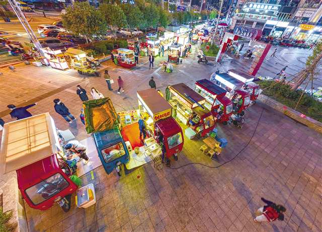 夜幕降临,华灯初上,丰都县龙河新城帝景江山小区门前,“车轮上的夜市”迎来热闹场景——特色三轮摊位整齐排列,吸引人流熙攘,城市烟火气跃然而现。这是丰都县通过创新治理方式,将游摊占道这一城市痛点转化为治理亮点的生动实践。